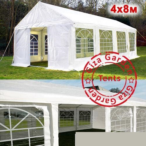 Шатер 4x8 м в комплекте с боковыми стенками с четырьмя ПВХ окнами размером 97х115см. в каждой.