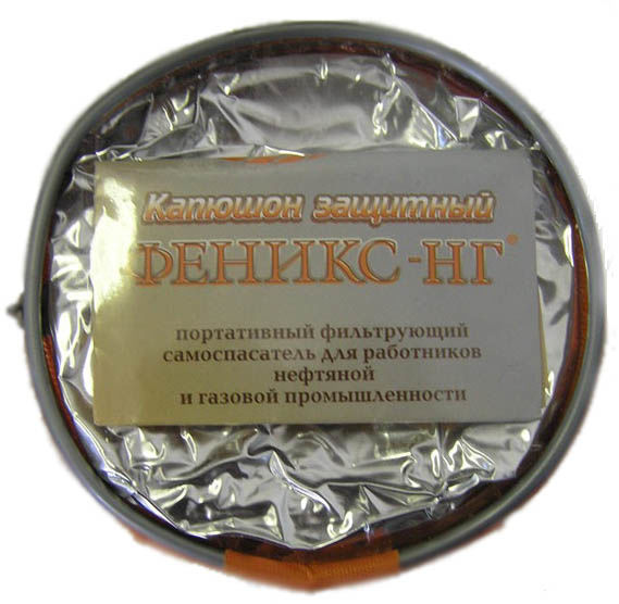 Капюшон защитный "Феникс-НГ" представляет собой модификацию базовой модели и предназначен для использования в качестве эвакуационного средства работниками газовой и нефтегазовой промышленности. Фильтрующе-поглощающая система КЗ "Феникс-НГ" обеспечивает защиту от паров циклических и полициклических органических веществ, серосодержащих органических и неорганических веществ, продуктов горения, а также других АХОВ групп А,В,Е,К.
