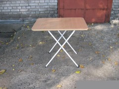 Компактный и легкий складной стол, отличающийся лаконичным дизайном, может использоваться в качестве торгового оборудования, имеет столешницу размером 0,75*0,5 метра, изготовленную из ламинированного ДСП. Применение данного материала для производства столешницы обеспечивает ровную и гладкую поверхность готового изделия, устойчивую по отношению к повышенной влажности и резким перепадам температур.