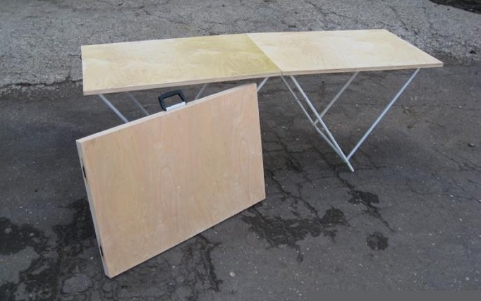 Прочный и качественный складной стол, отличающийся своими габаритными размерами. Конструкция стола включает в себя две одинаковые части, представляющие собой соединенные вместе два столика с ножками, выполненными в виде треугольника. В разложенном виде столешница имеет следующие размеры: 60 сантиметров в ширину и 180 сантиметров в длину. В сложенном виде стол представляет собой лист с габаритными размерами 60*90 сантиметров и толщиной не более 1 сантиметра. Кроме того, для удобства транспортировки в сложенном состоянии столик имеет специальную ручку.