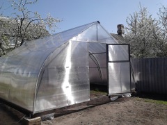 Каплевидная форма каркаса снижает возможность залегания снега. Установленные подкосы на арках придают дополнительную жесткость теплице.